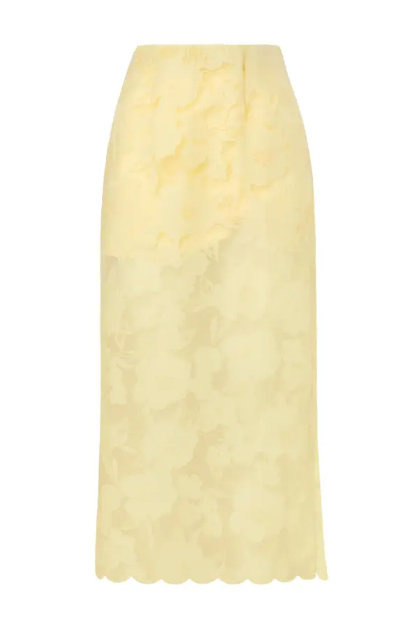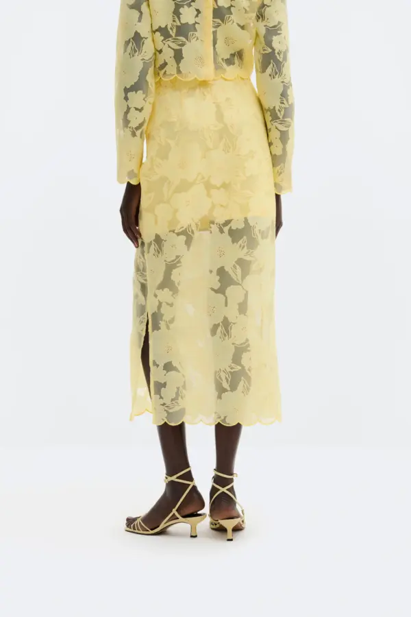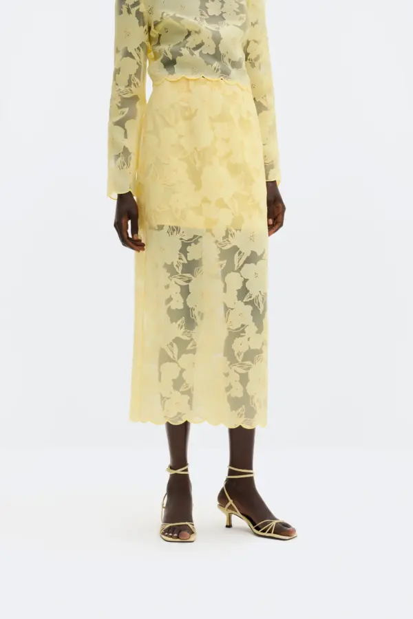 Transparenter Midirock aus floraler Spitze mit gewelltem Saum.