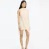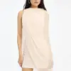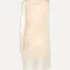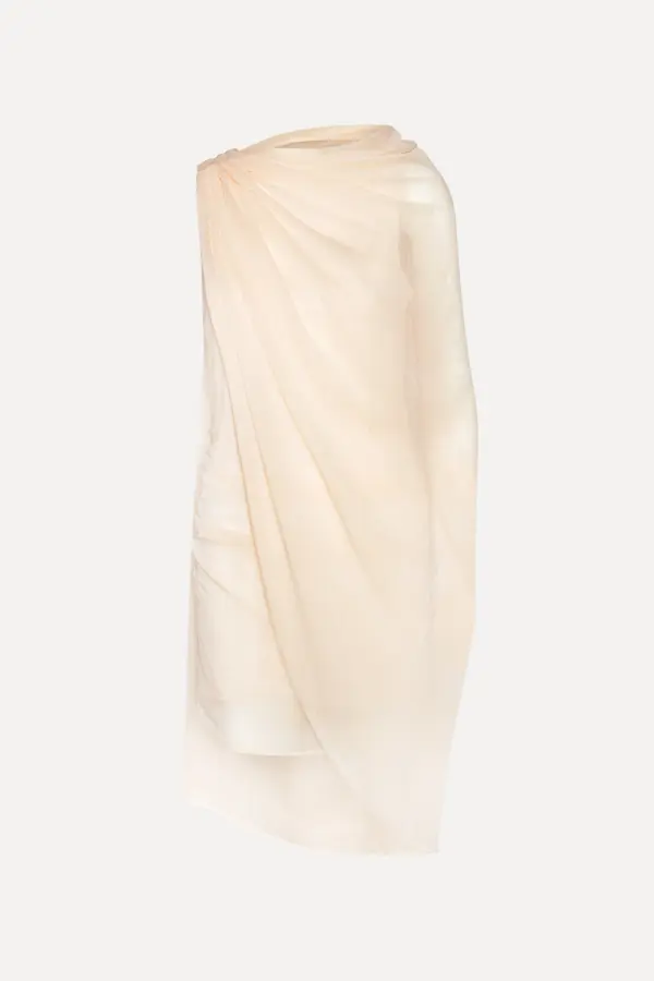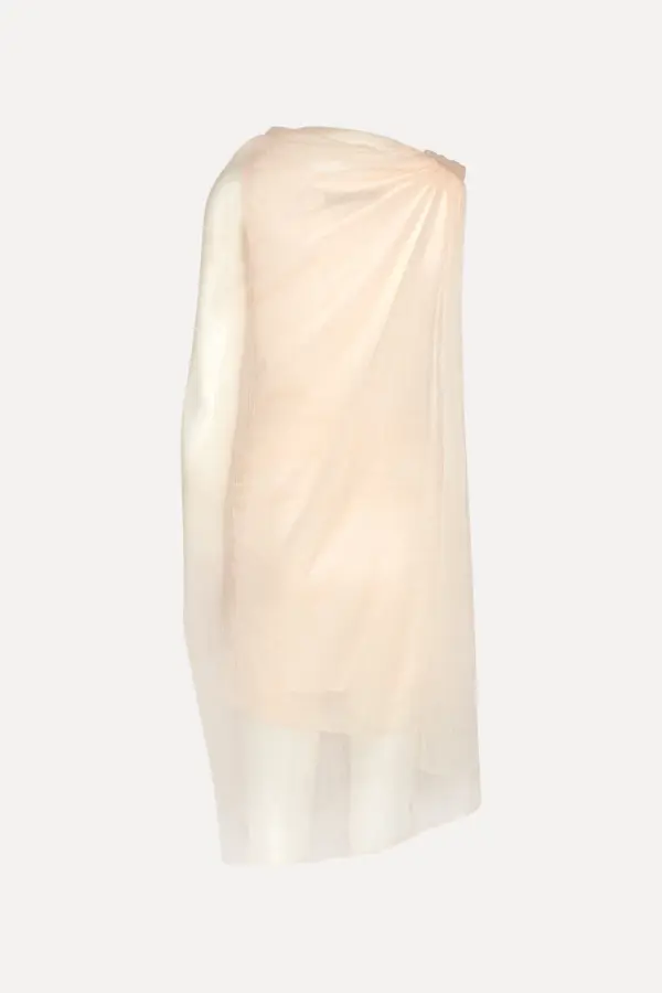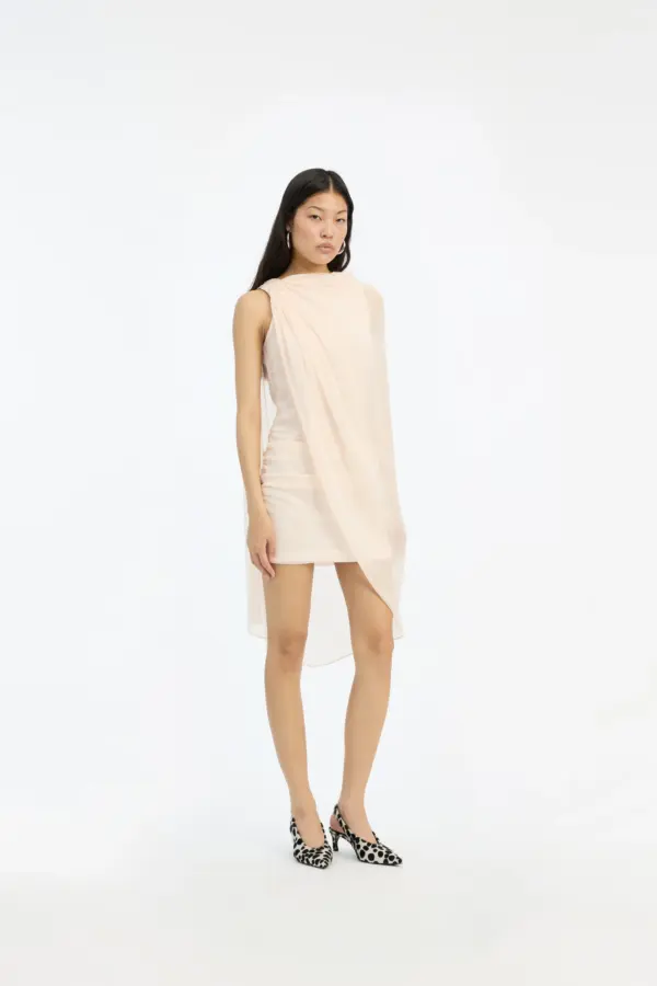 Chiffon mini cape dress light pink is a mini dress crafted in lightweight chiffon with an asymmetric cape design. the dress features a draped upper section with soft folds and a semi-sheer outer layer that falls loosely around the body. it is lined and has a light, airy appearance with a clean and elegant silhouette