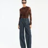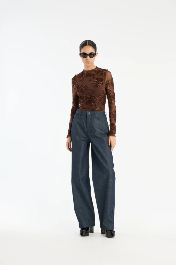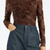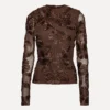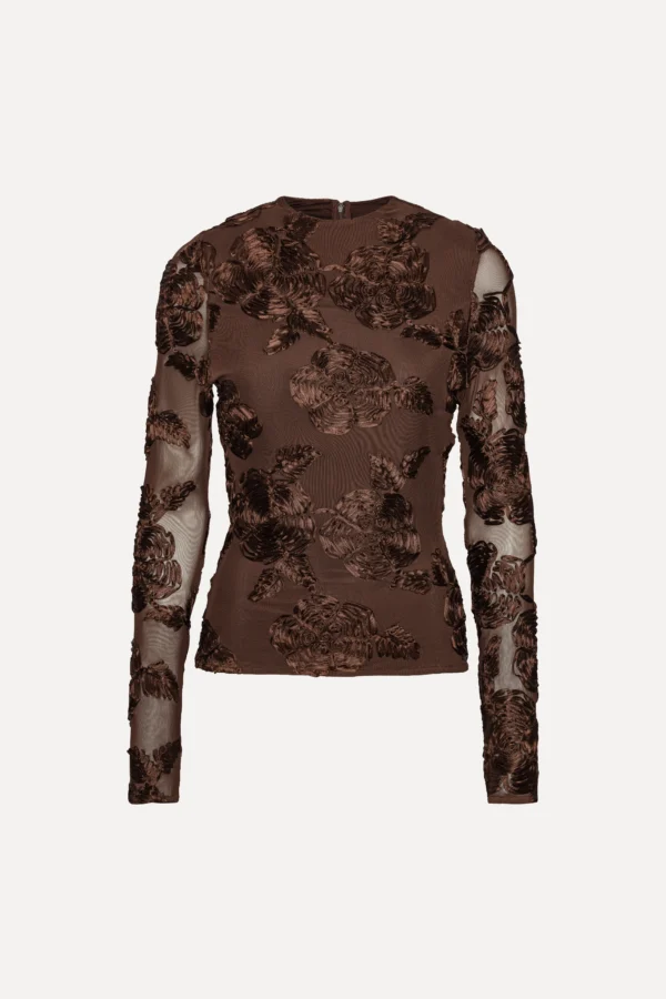 visit usflower mesh ls top dark brown is a fitted long-sleeved top with an all-over floral texture. it features a round neckline, sheer sleeves, and a visible zip at the back. the top is lined through the body and designed to match the flower mesh pencil skirt dark brown.