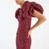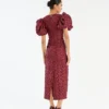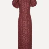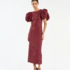 visit usJacquard midi puffy dress burgundy is designed with short voluminous puff sleeves, a round neckline, and a slim-fitted silhouette. the dress has a midi length, textured jacquard surface, and a slit at the back hem. a concealed zip is placed at the back.