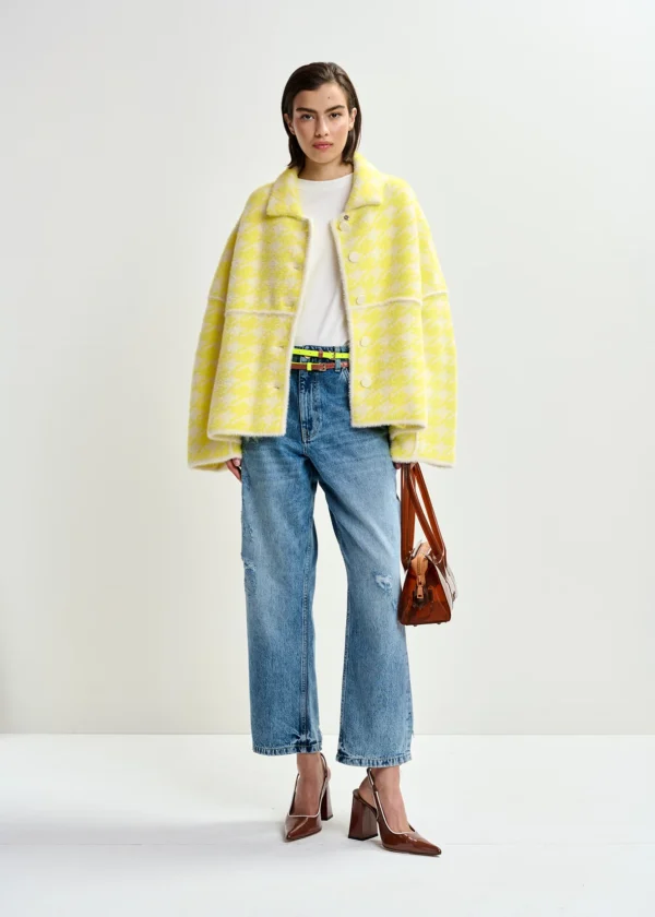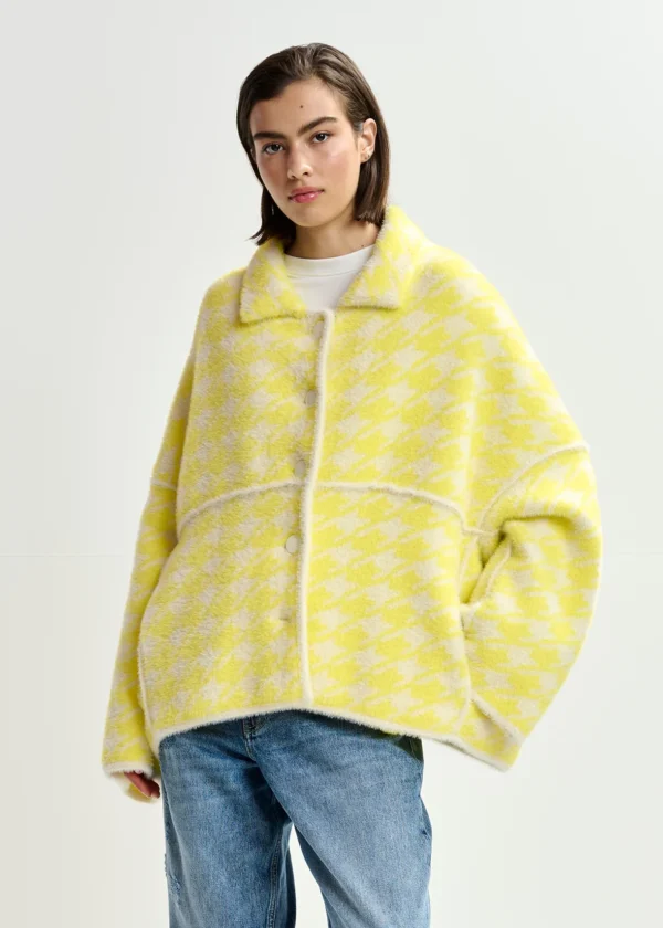 visit usSpun from a midweight knit with a soft, tactile finish, this jacket is shaped for an easy, relaxed fit that drapes effortlessly. The bold houndstooth pattern brings a playful graphic edge, while the clean button front and structured collar balance the silhouette with a refined touch. Finished with gently curved lines and subtle panel detailing, it offers comfort and character in equal measure.